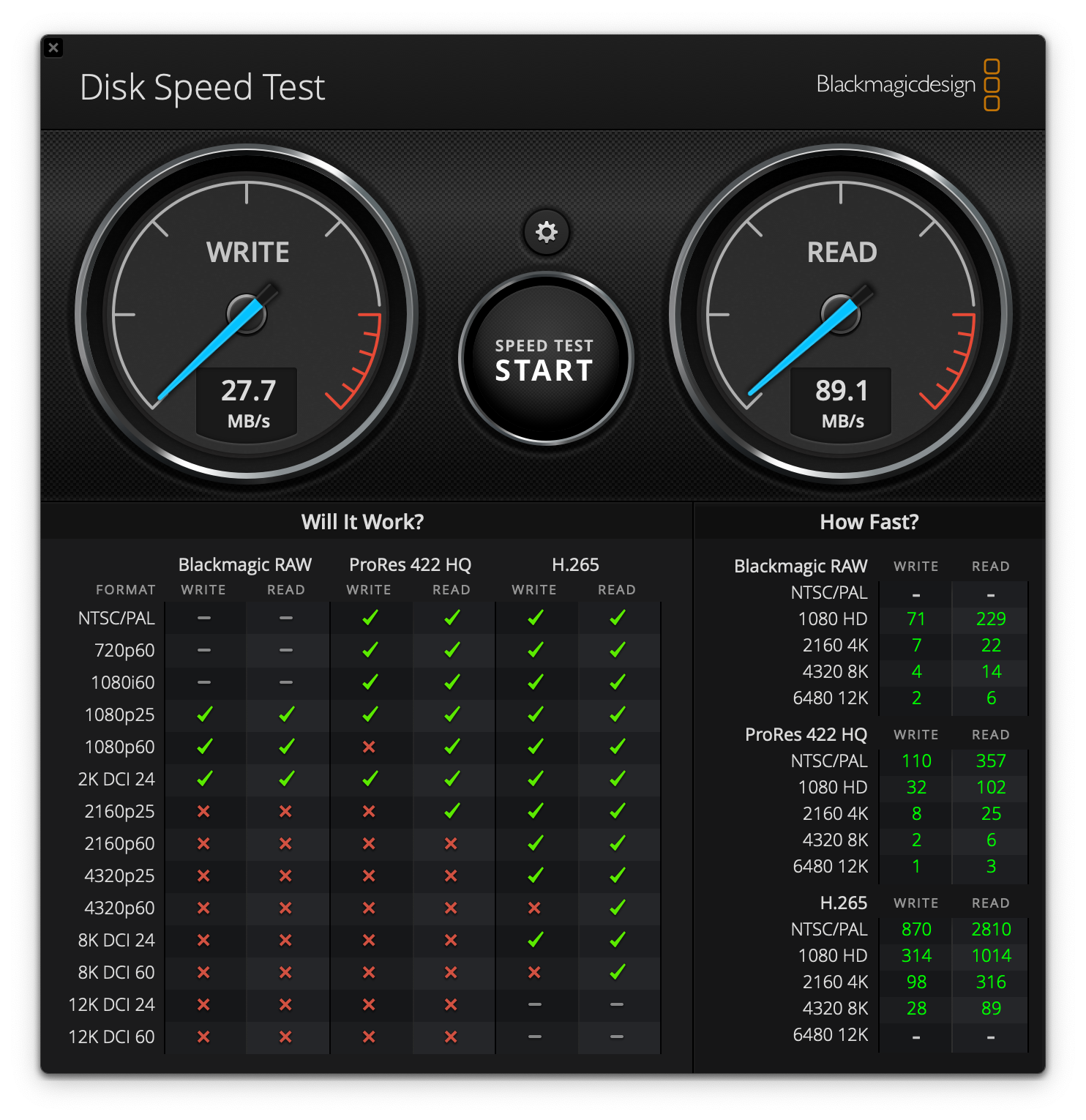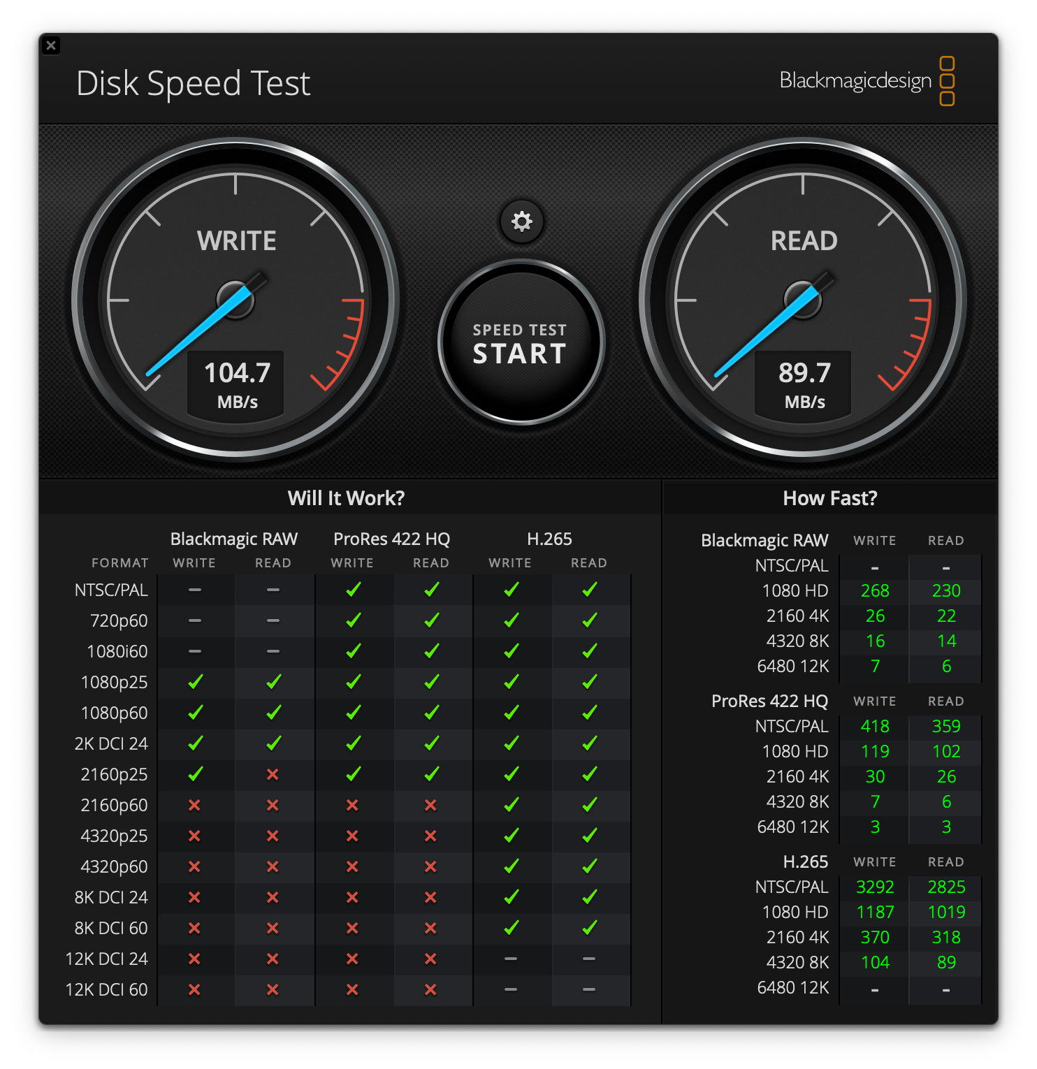 맥북에서 BlackMagic Speed Test (2GB)