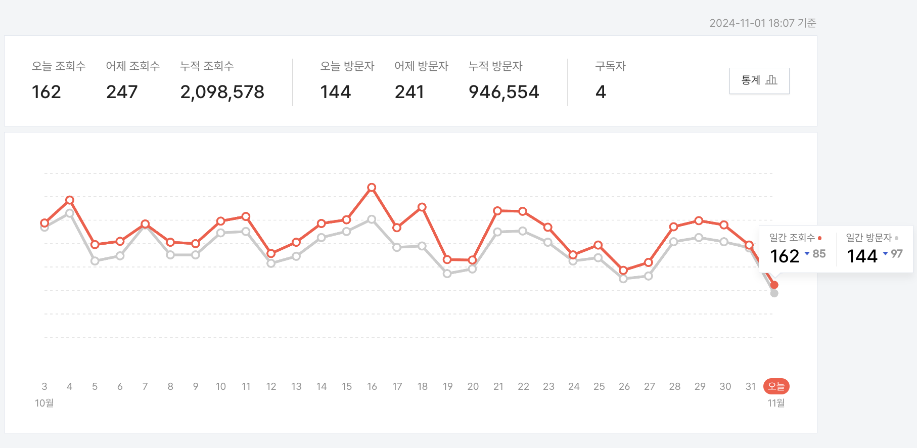 이 스크린샷은 관리 페이지 메인에 있는, 현재 블로그의 한 달 조회수 추이입니다.