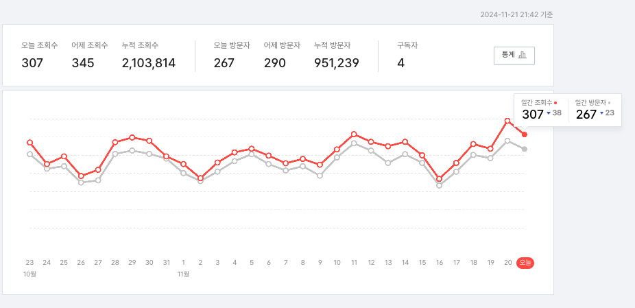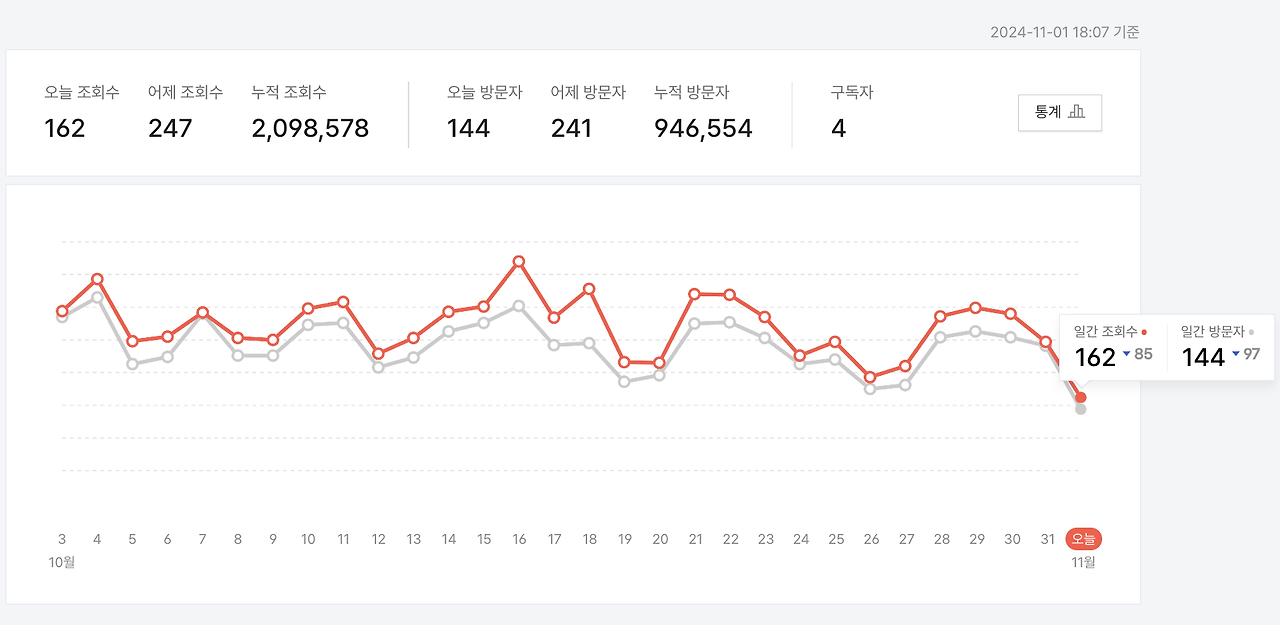 (어차피 블로그 특성상 방문자수나 조회수나 얼추 비슷합니다)