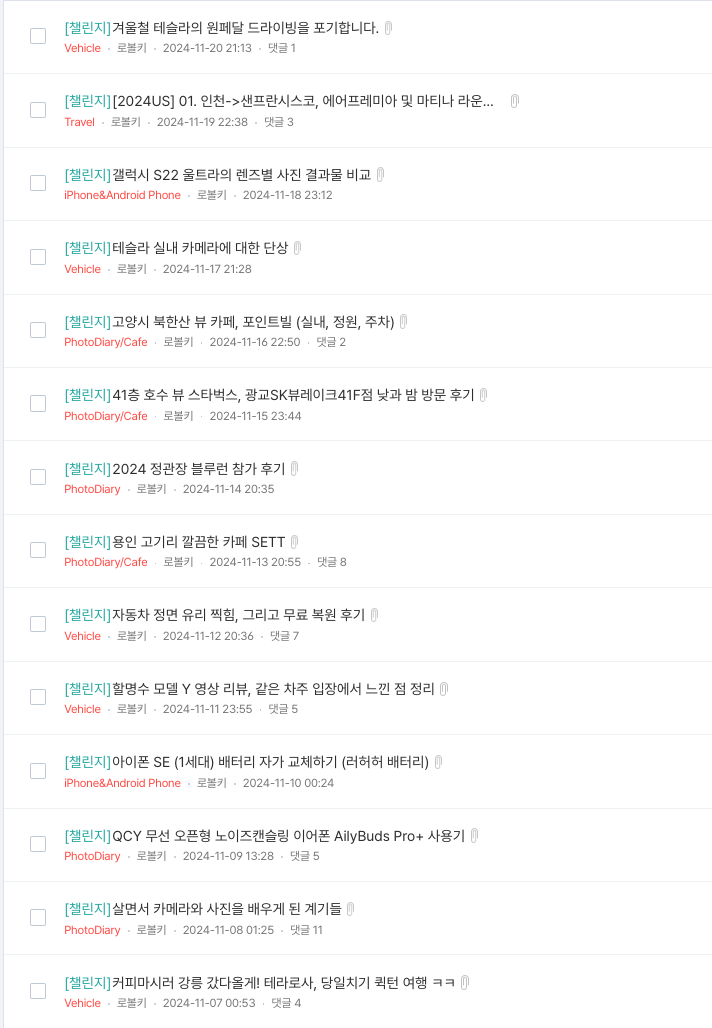 | 티스토리의 매일매일 글쓰는 챌린지가 시작됩니다. (11/07~) (0) | 2024.11.01 |