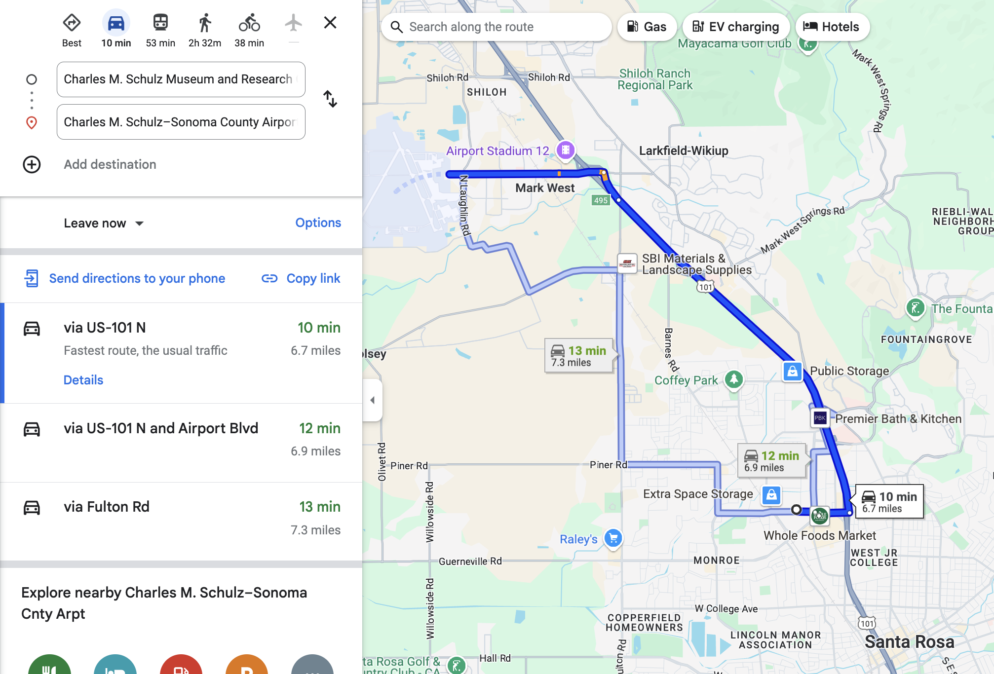 샌프란시스코 국제공항에서 스누피 박물관 (Charles M.Schulz Museum)까지는 차로 약 1시간 20분, 거리는 약 120km의 거리입니다.