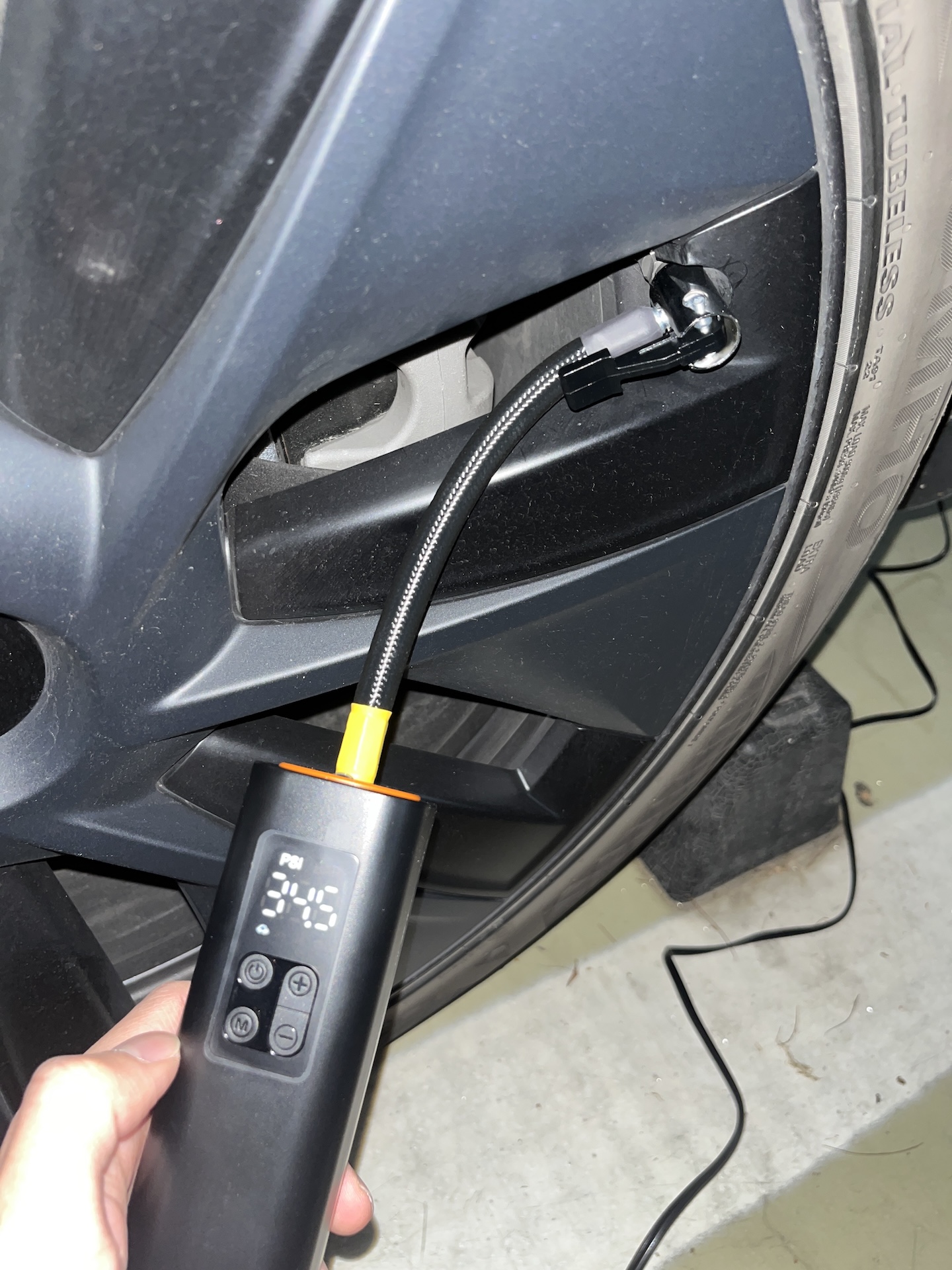 12V 유선이라 센터 콘솔의 12V 포트에 꽂고, 창문 내리면 각 타이어에 꽂을 정도의 길이가 나옵니다.
