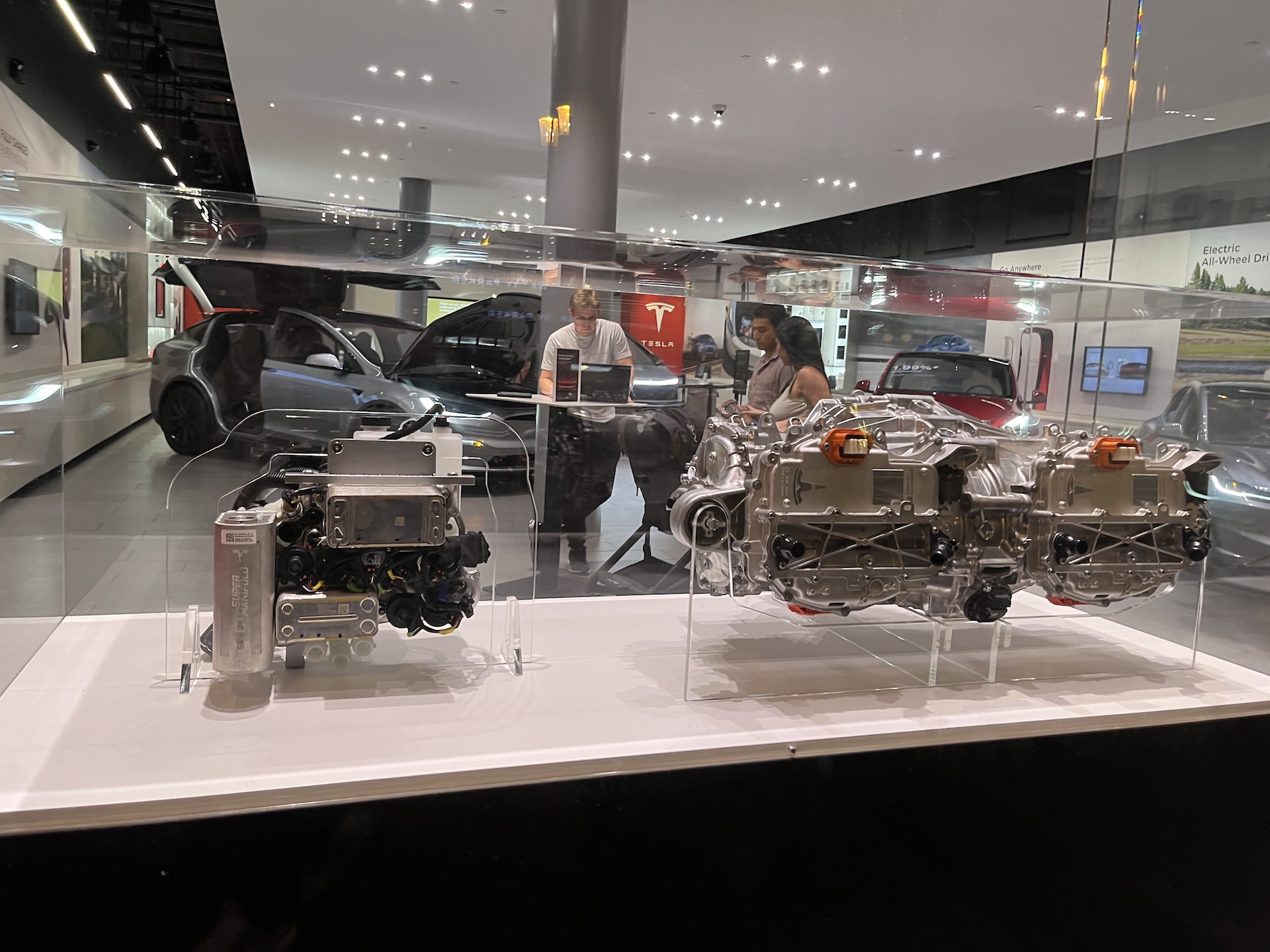 각종 모듈, 오토파일럿 카메라, FSD 컴퓨터 등등 전시.
