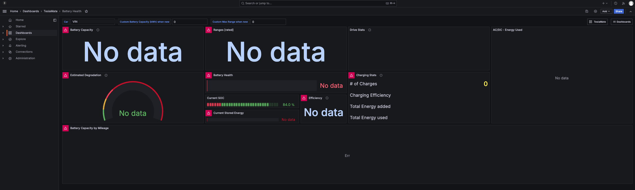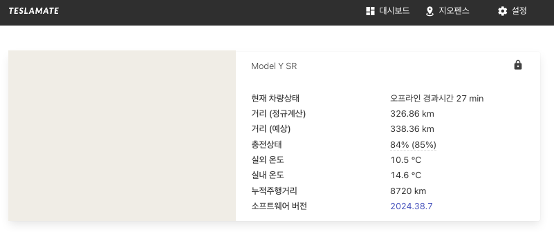 일단 현재는 teslamate 첫 설정이므로, 가운데 SOC (State of Charge, 배터리 현재 상태) 말고는 대부분 no data로 뜨는데요,