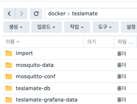 docker 에 teslamate 폴더 생성, 그 안에 5개 폴더 생성
