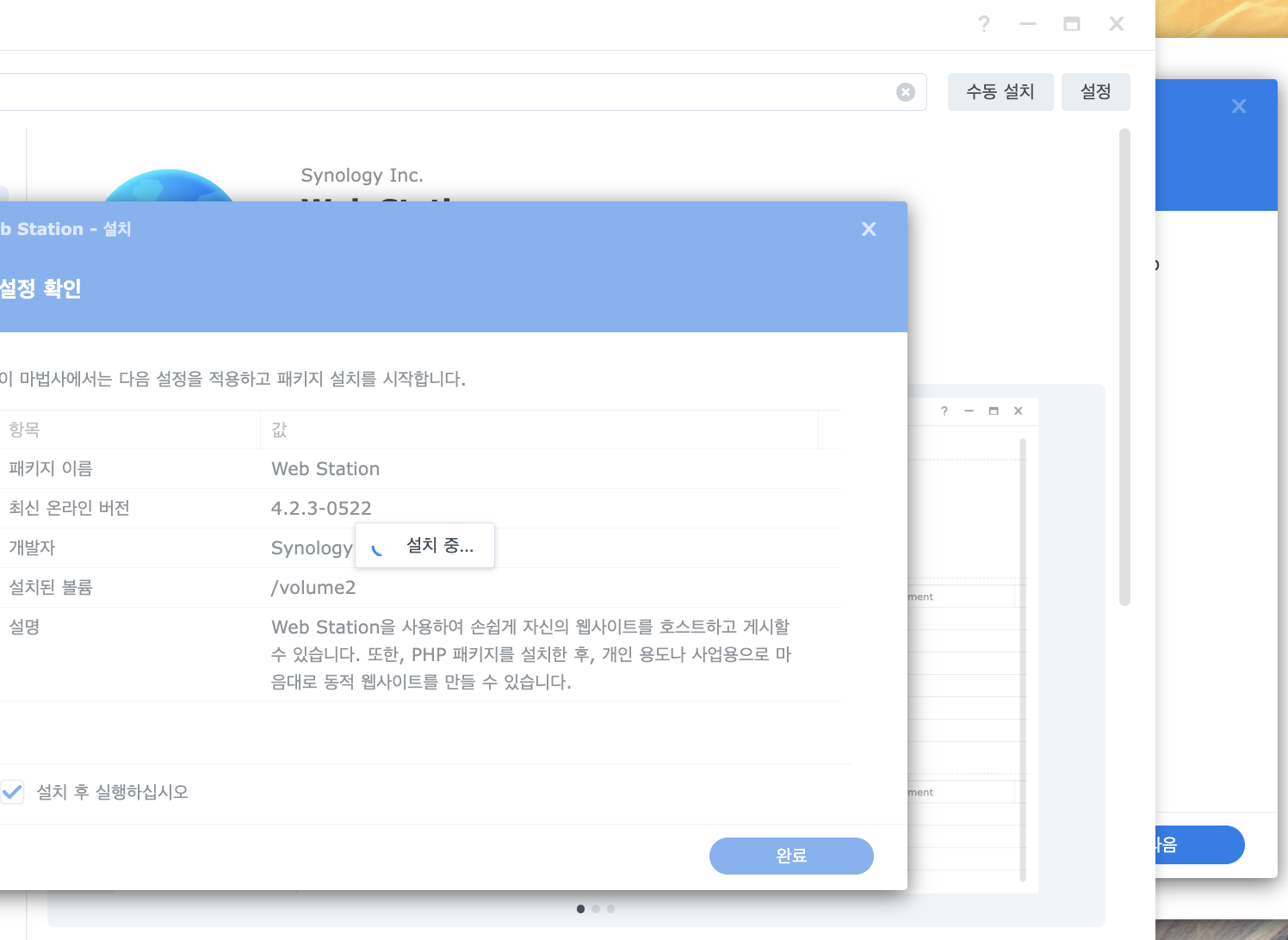Web Station이 필요하다고 뜹니다.(이미 설치되어 있으면 안 뜰 수도 있어요)