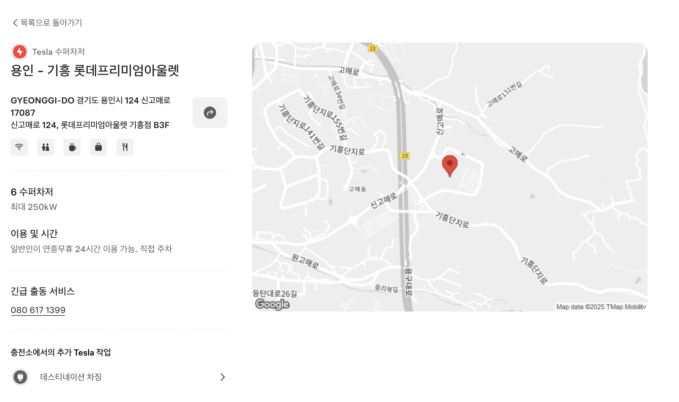 | 특이사항 | 입구에 따라 지하 3층으로 들어설 수 있으니 진입시 층 확인 필수 충전기 위치는 지하 3층 출구쪽에 가까운 A5 벽면에 위치함 옆에 별도로 데스티네이션 차저 6기 있음 |
