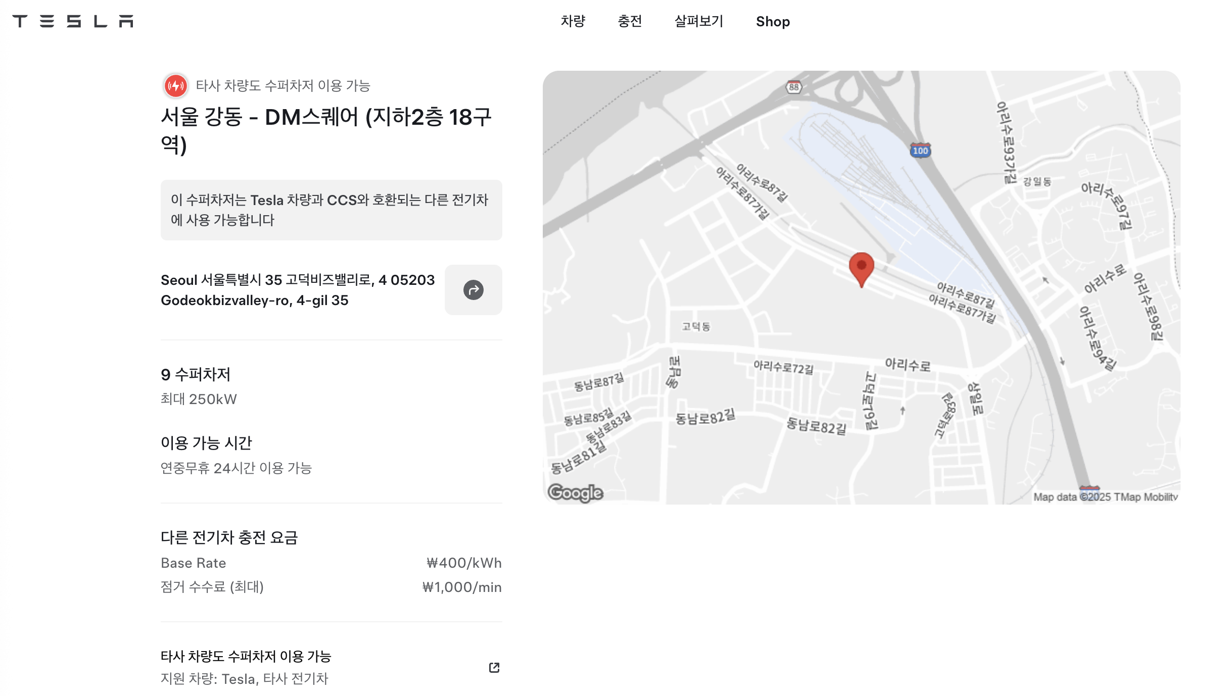 | 특이사항 | 지하 2층에 위치하며, 옆에 데스티네이션 차저 1기도 있으나 테슬라 데스티네이션 차징 리스트에는 안써있습니다. 어차피 30분 넘으면 비싼 주차비 부과돼서 건물 담당자 아니면 쓸 일 없을듯? |
