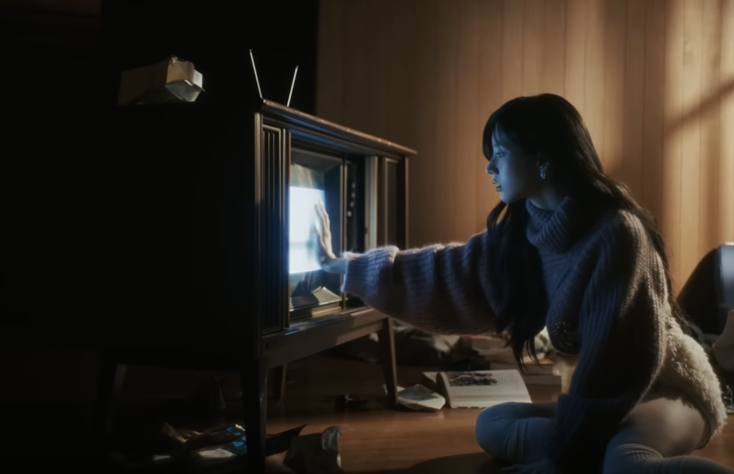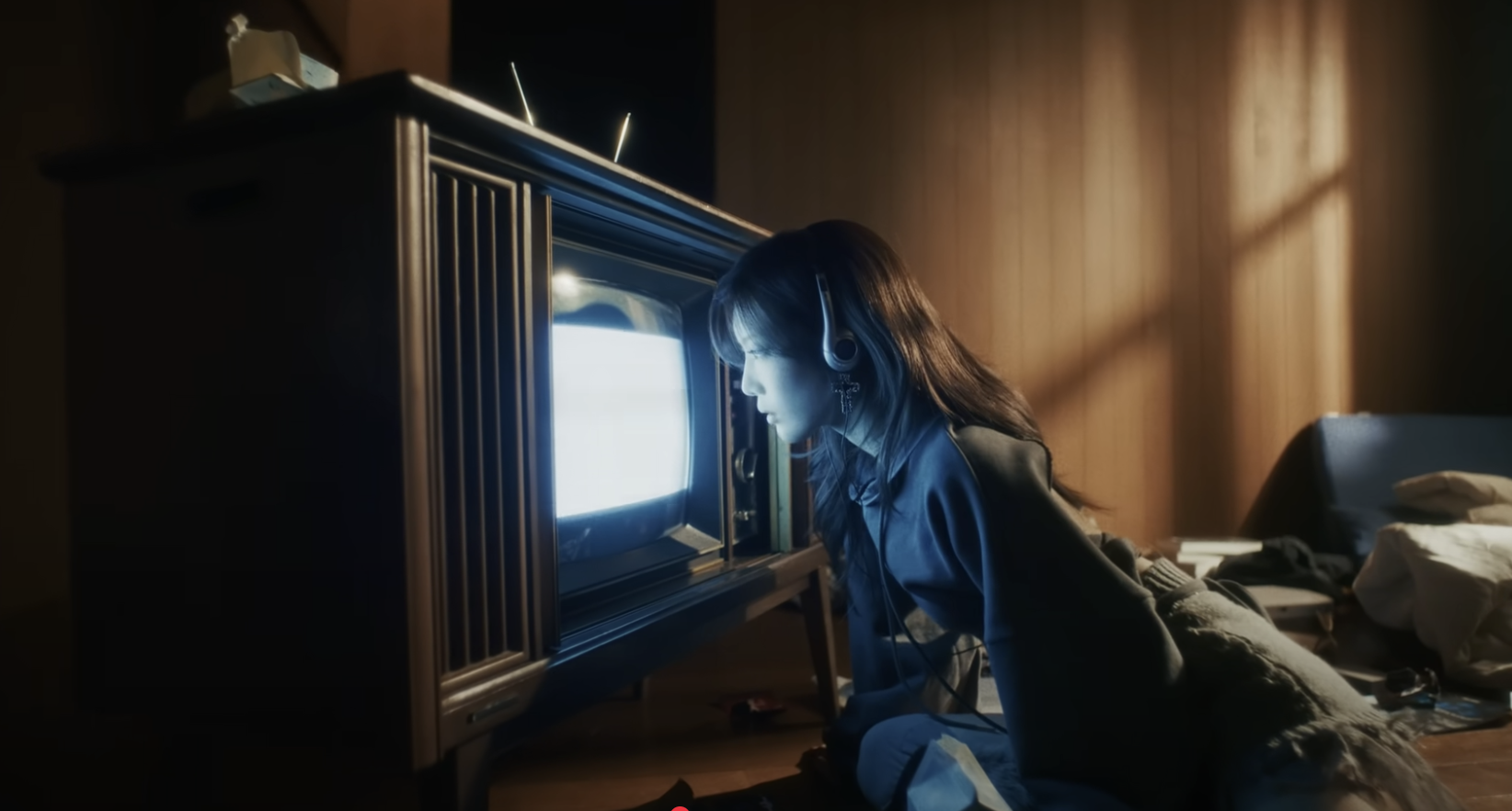 수많은 우유팩이 널브러진 방에, 헤드셋을 끼고 티비를 응시하는 최리.