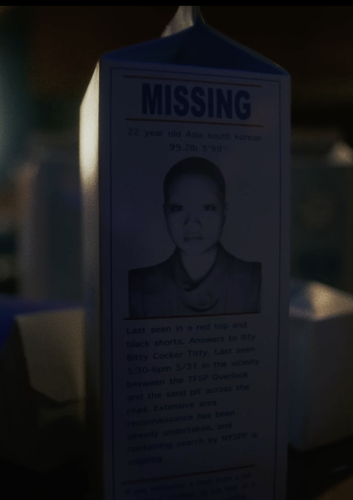 Last seen in a red top and black shorts. Answers to Itty Bitty Cocker Titty. Last seen 5:30-6pm 5/31 in the vicinity between the TFSP Overlook and the sand pit across the road. Extensive area maintenance has been already undertaken, and containing search by NYSPP is ongoing.
