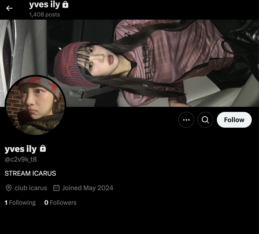 | 프로텍트 계정이나, 이브 사진을 걸고 yves ily 라고 하는걸 보니 해외팬이 아이디 선점한 듯. | 이 계정은 공개 계정이고, 가입일이 2025년 6월인것으로 보아 아이디 새로 만든 계정으로 추측됨 (팬인듯) 이 계정 프사는 Virtual Angel 뮤비 장면. |