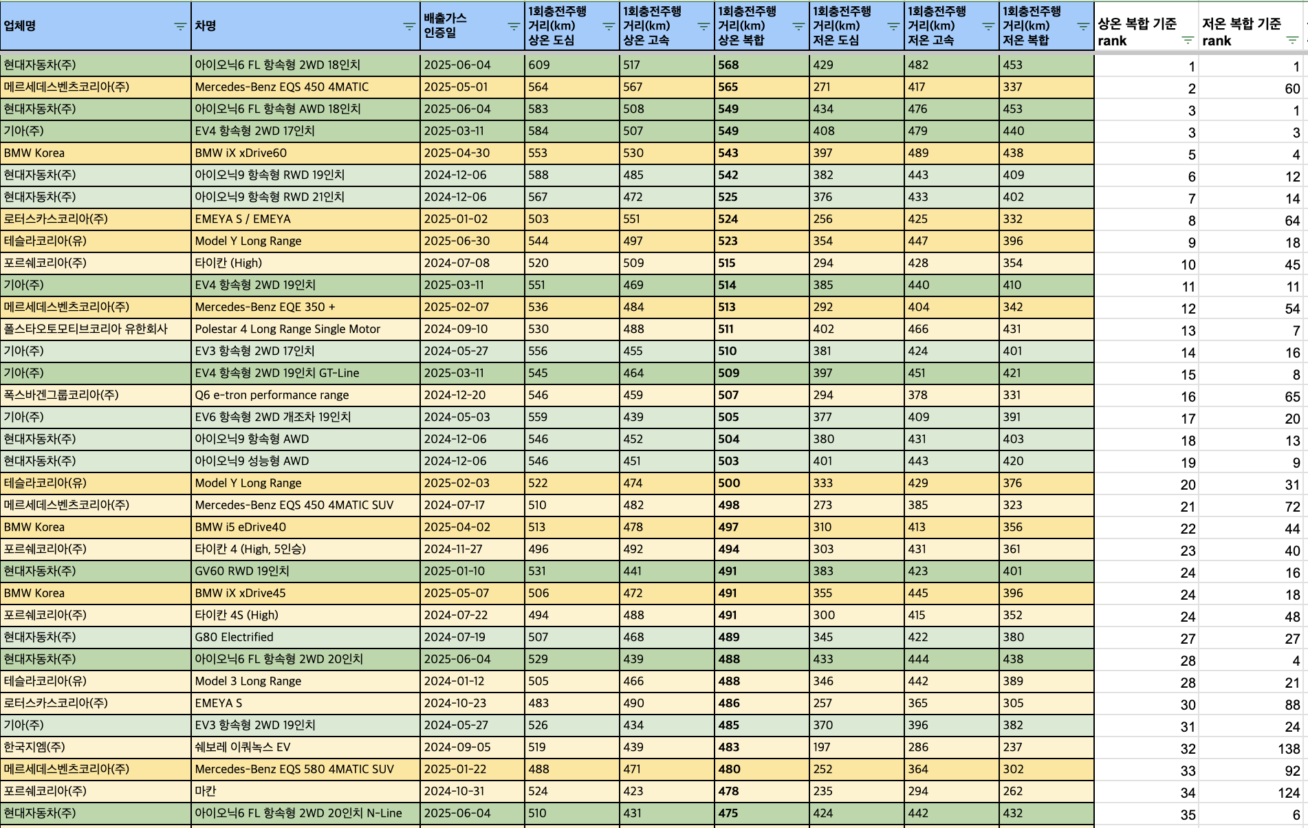 공동 3위 아이오닉6 AWD의 549km, 그리고 EV4 2WD 17인치가 549km를 차지합니다.
