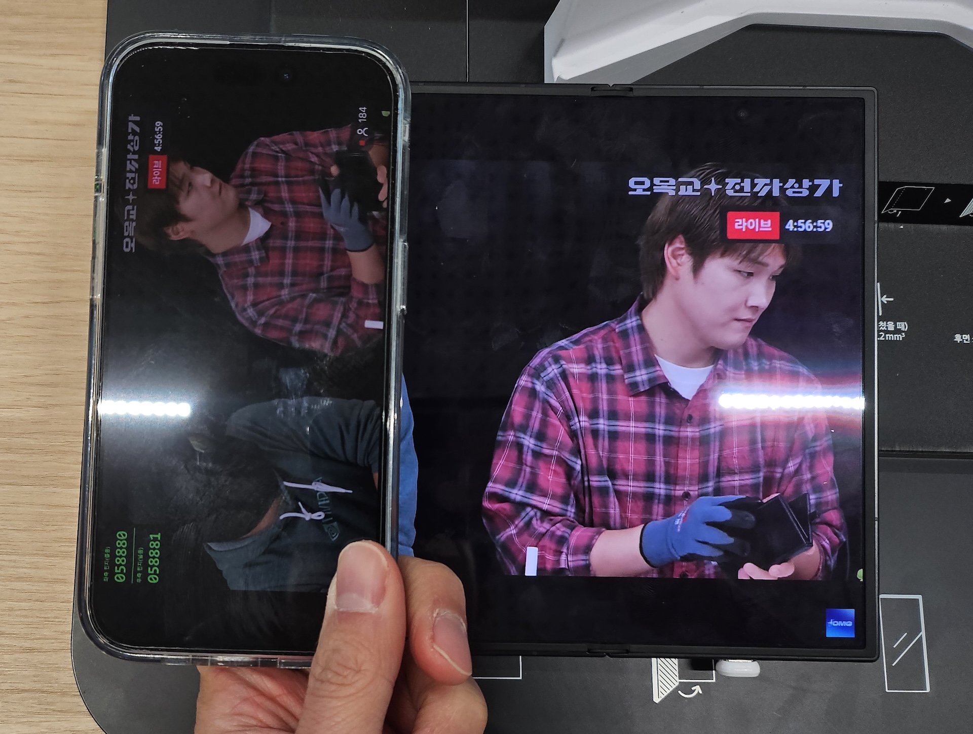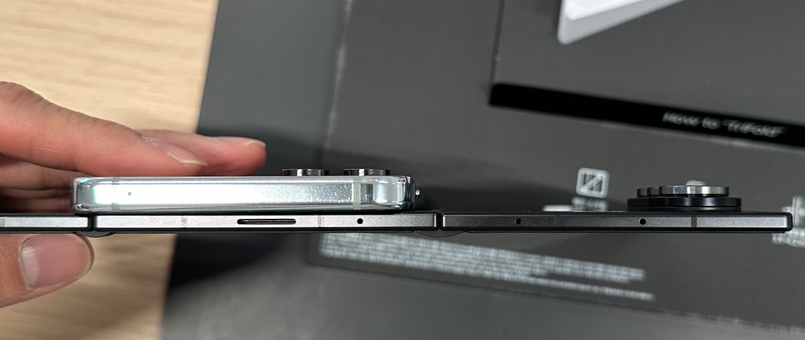 두께 비교. 참고로 위에 얹은 폰은 갤럭시 Z 플립 5입니다.