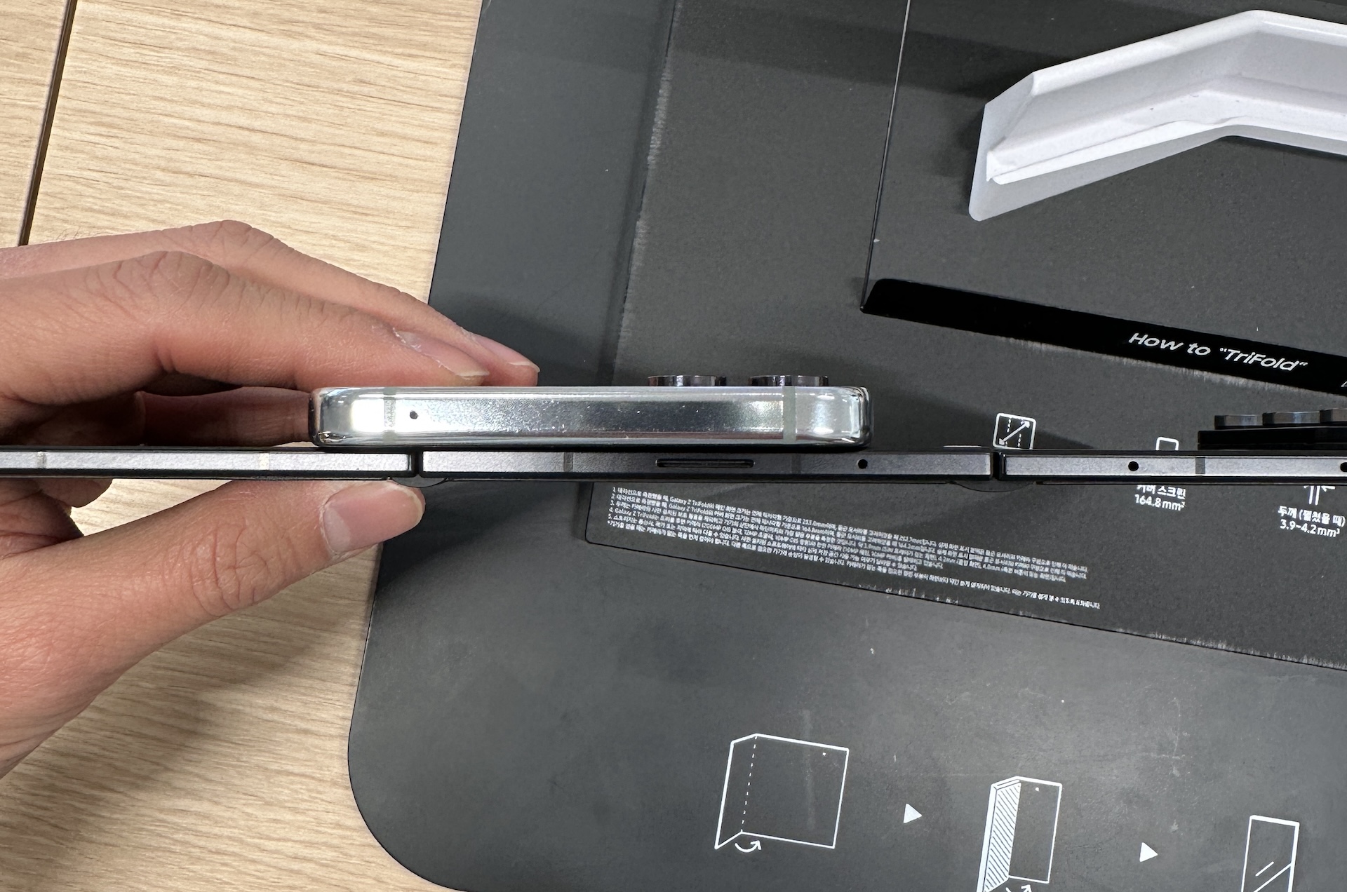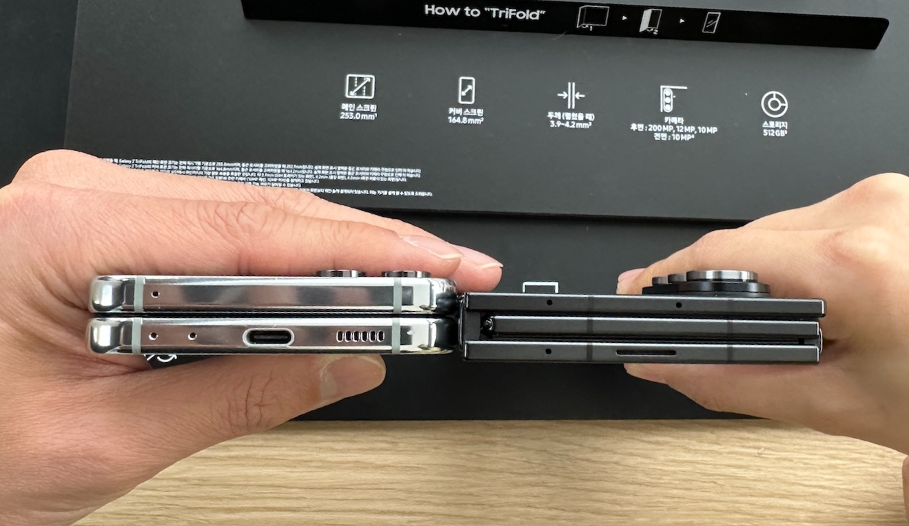 트라이폴드 접은 두께는 12.9mm, 펼쳤을 때는 패널에 따라 각각 3.9mm, 4.2mm, 4.0mm라고 합니다.