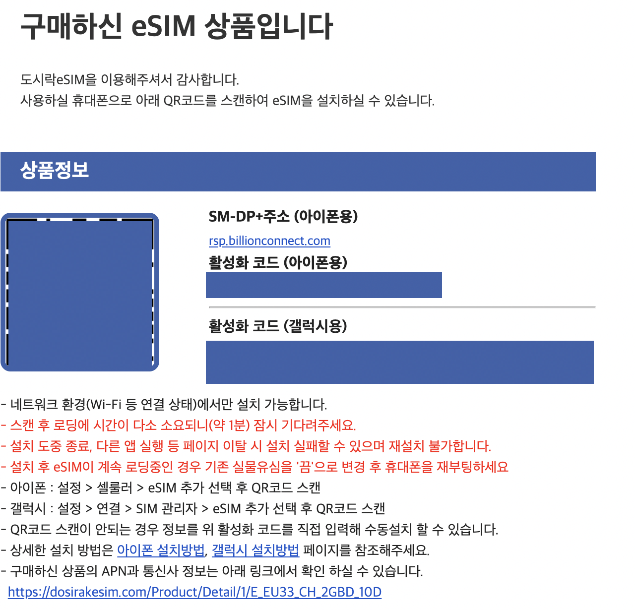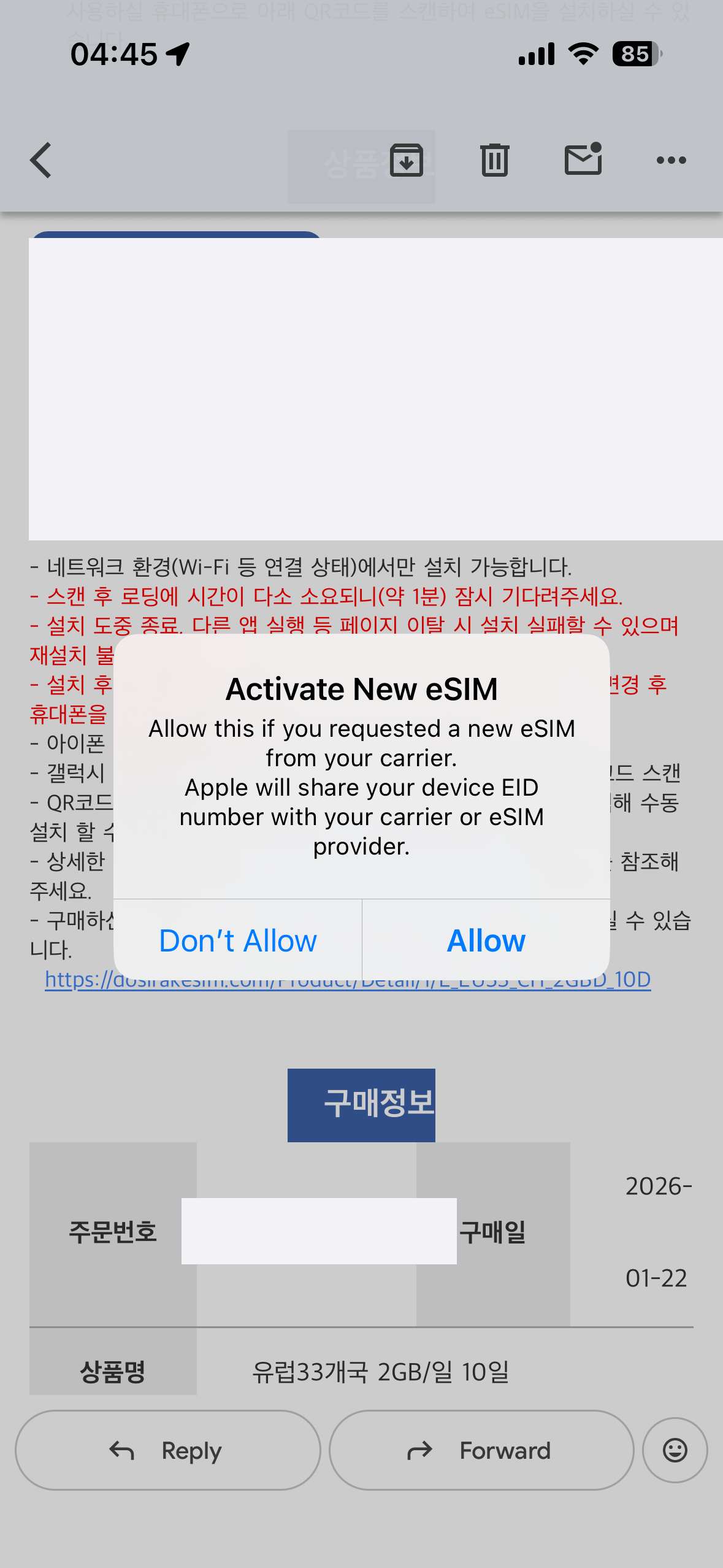 메일의 QR코드를 누르면 유심 설치 창으로 넘어갑니다.