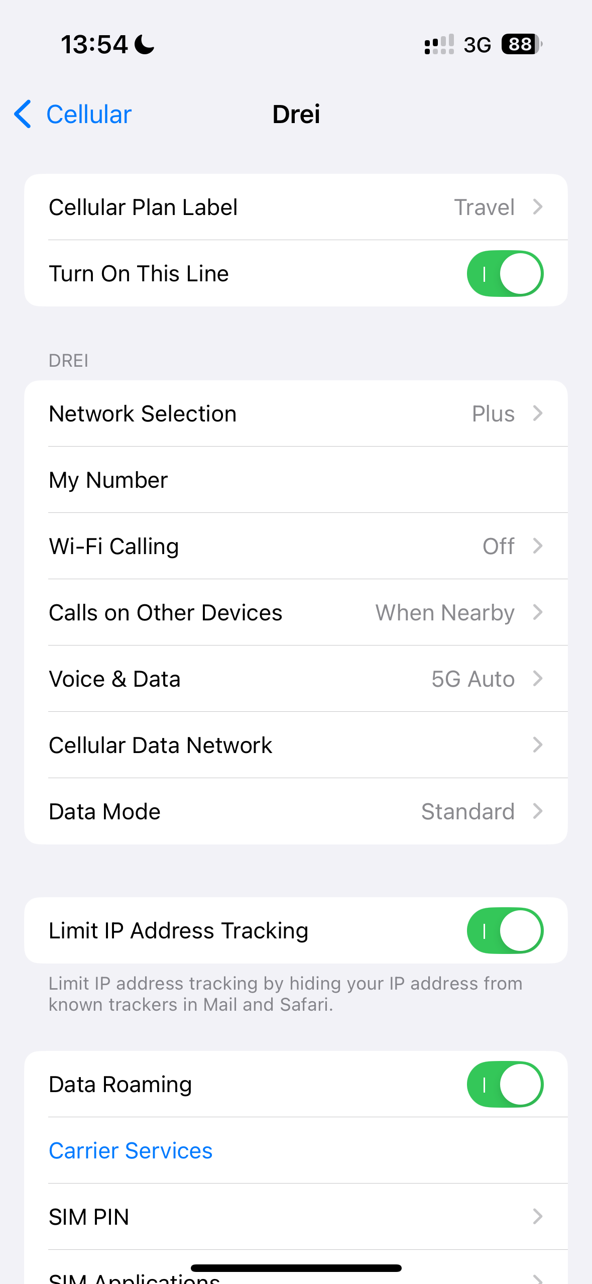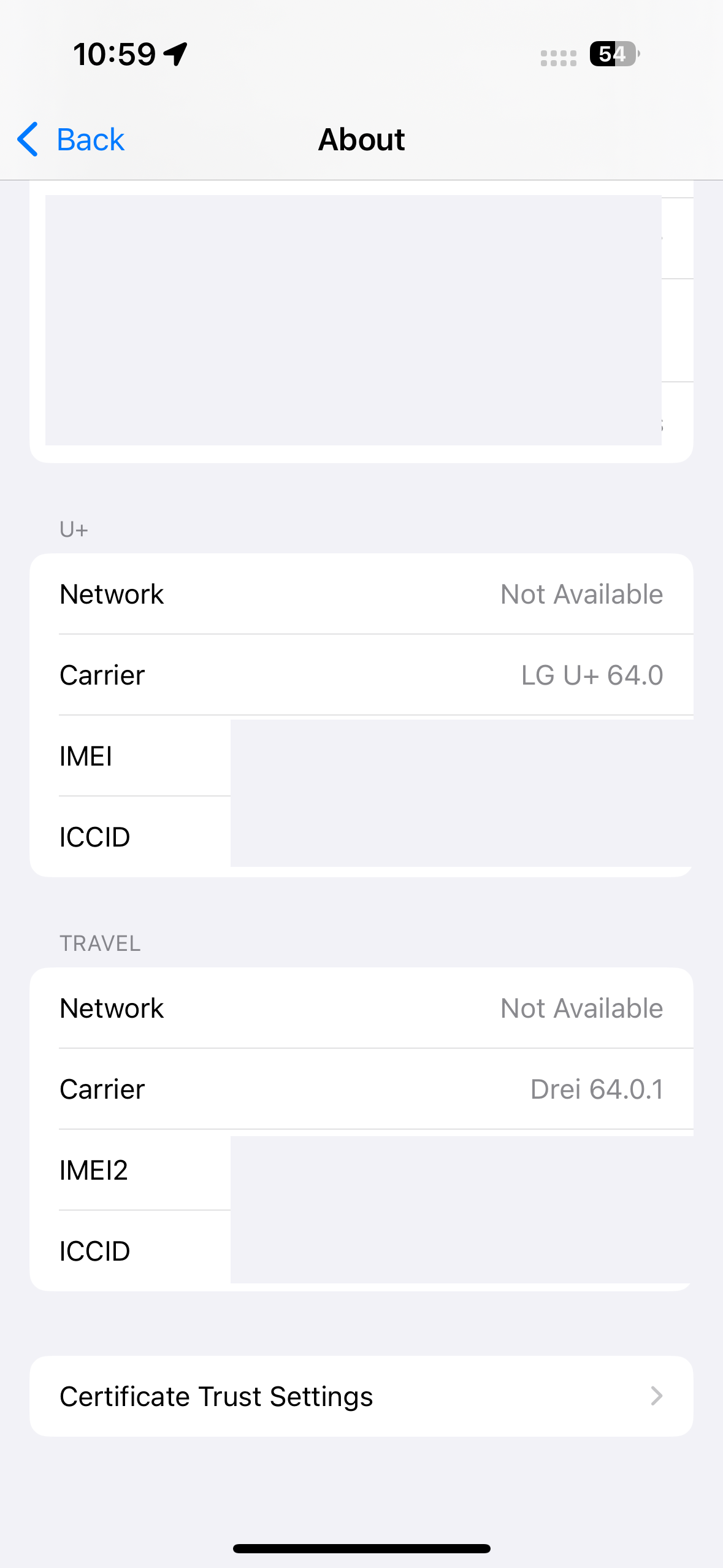 Travel로 설정을 완료하면 이렇게 IMEI / IMEI2 두개의 유심이 있는걸 확인할 수 있고요.
