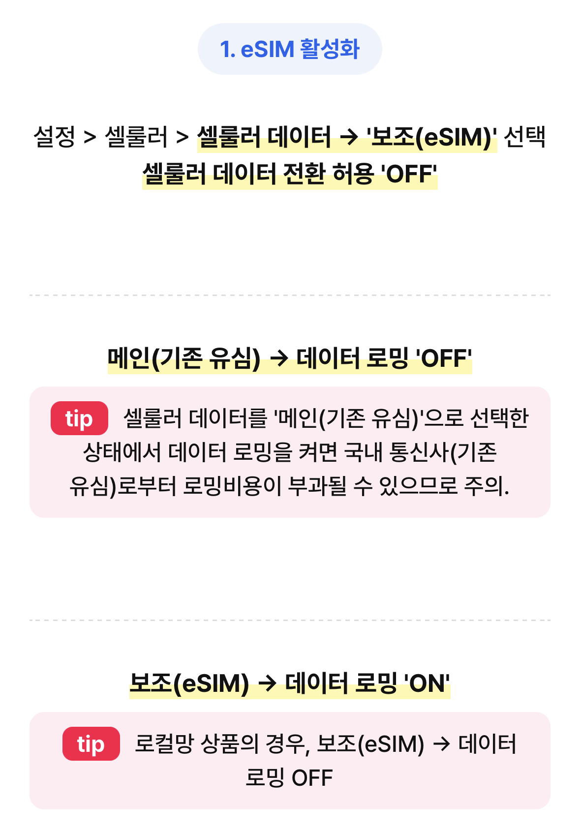 기존 유심(물리심) 네트워크의 데이터 로밍을 켜면 eSIM 데이터를 추가한 의미가 없죠?